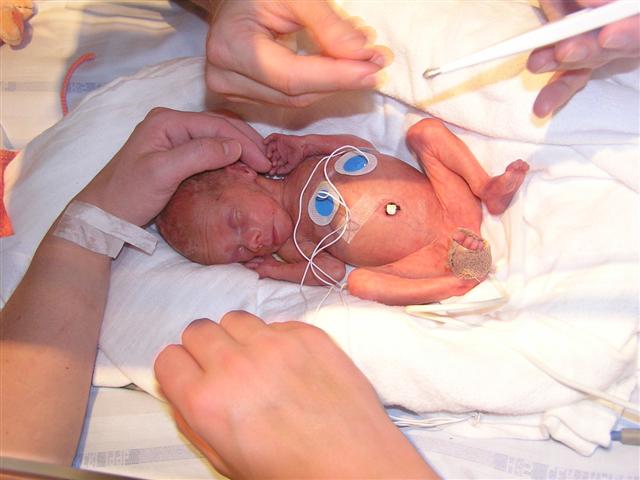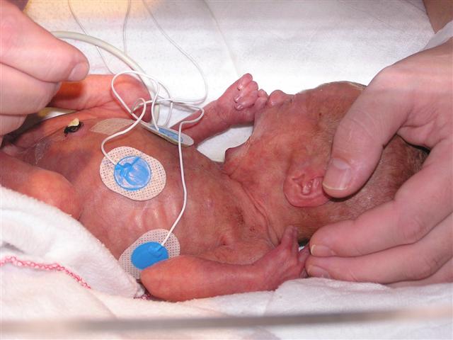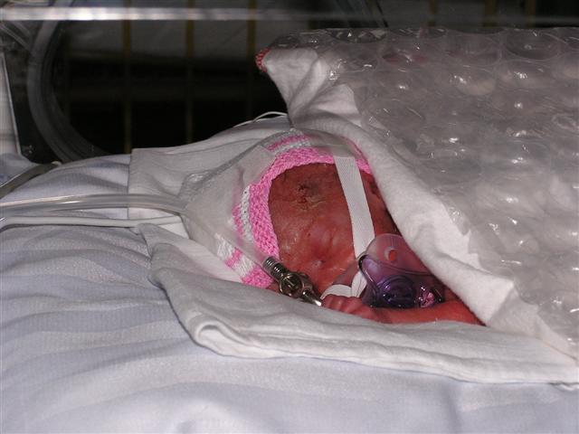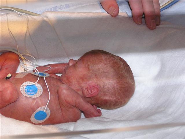 Ida i kuvøsen. Elektroderne måler Ida's hjertefrekvens og åndedrætsrytme.