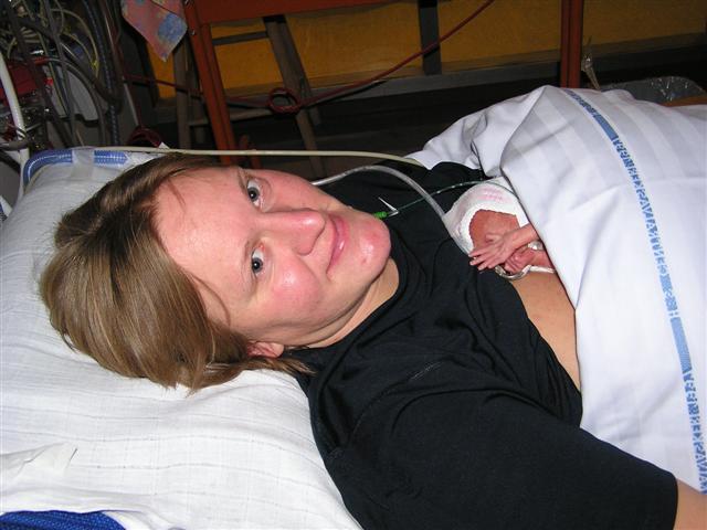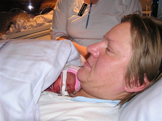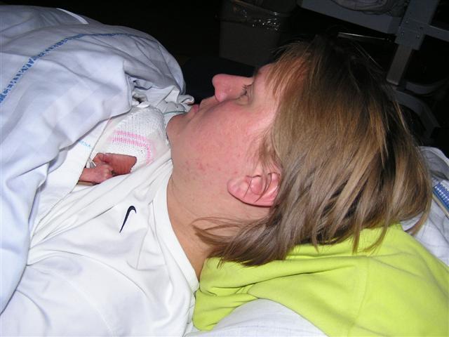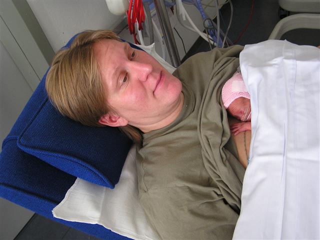 Dorthe, nu mor, holder Ida for første gang, cirka 3 timer efter kejsersnittet.