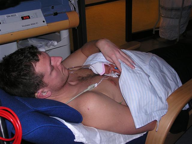 Far med Ida på brystet. Alle børn slapper bedst af i tæt kontakt med far eller mor.